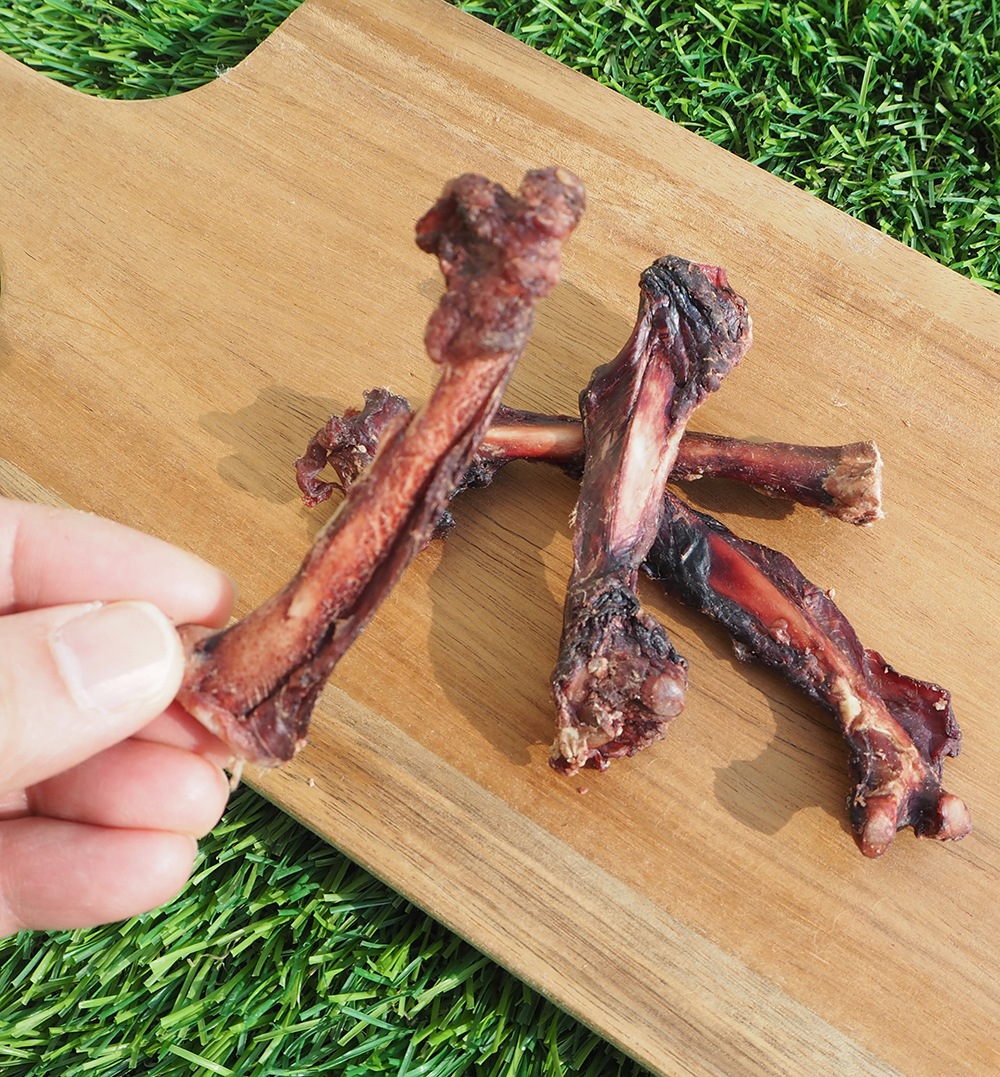 ・骨をかじる際、ごくまれに先端がとがる場合がありますので、オーナー様の目の届く範囲で様子をみながら与えてください。